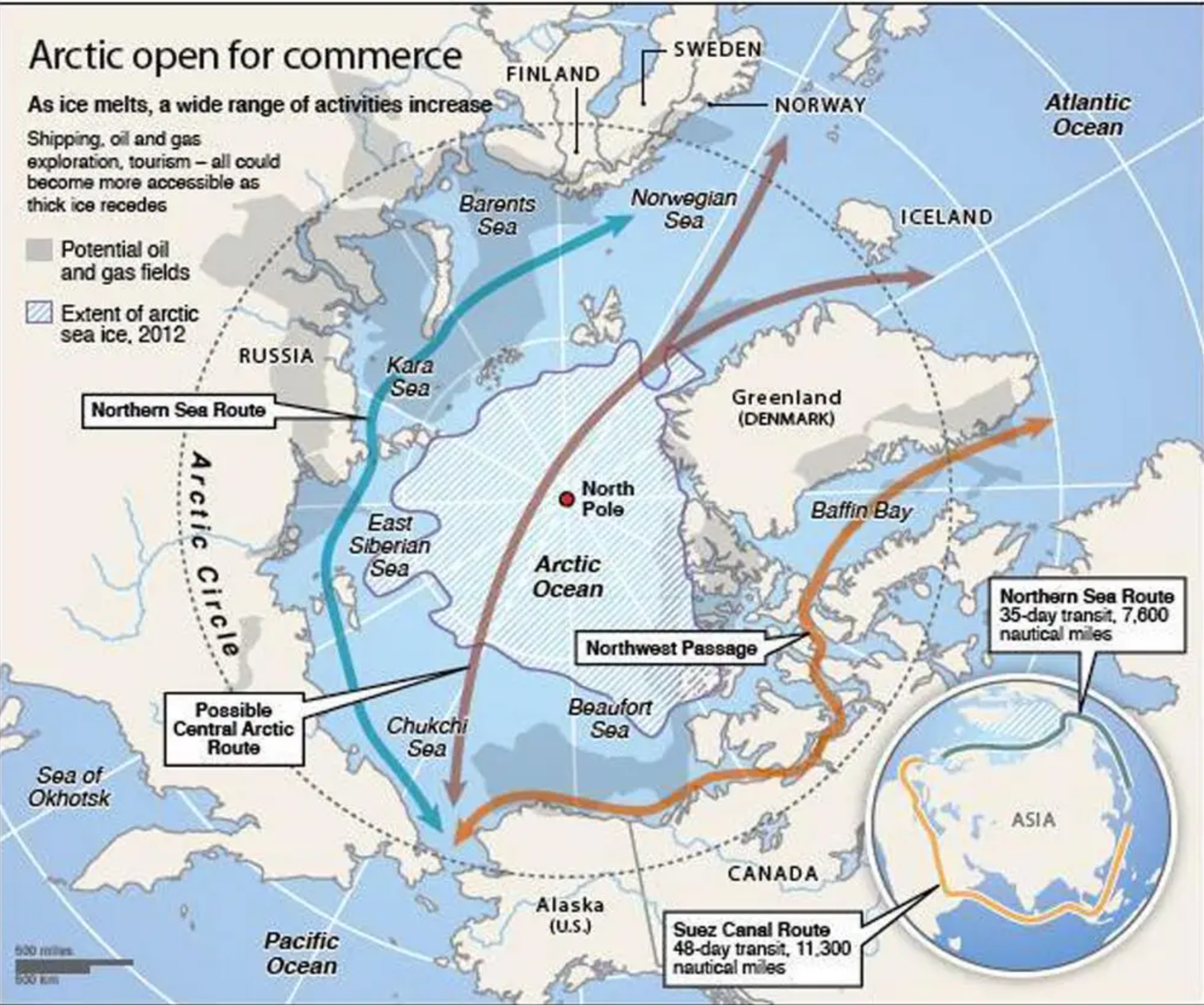 Vladimir Putin, President of the criminal enterprise known as Russia, said “Climate change brings in more favorable conditions and improves the economic potential of [the Arctic] region,” The melting of the polar ice cap … is seen as good news for Russia, whose ships are now able to navigate Arctic waters. This will also help open up exploration of the Arctic continental shelf, where substantial energy reserves still lie untapped.